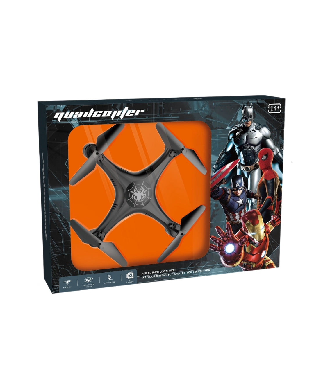 Launched into action with the Spiderman RC Drone, children aged 14 and up can experience thrilling aerial adventures inspired by the iconic superhero, featuring a sleek black and orange design that hints at its spider-like flying capabilities. The quadcopper-branded toy set showcases Spiderman characters and promises an exciting journey into the skies.