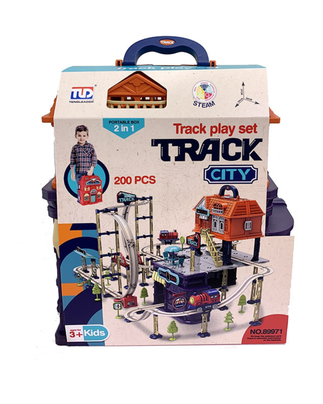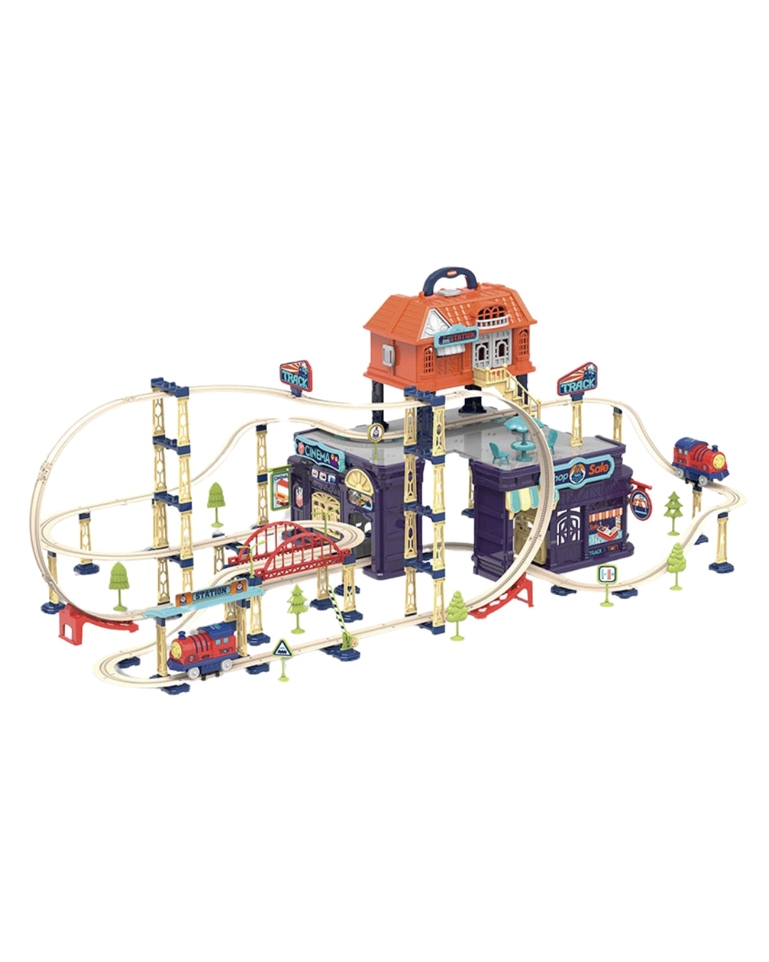 It is a colorful set of vehicle construction games that includes a variety of scenarios such as a track, parking area, cinema, sales shop, and train.