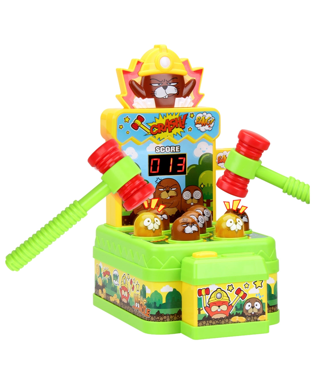 Whack-A-Mole arcade game for kids. This electronic pounding toy includes a scorekeeping system and two hammers for competitive play. It features lights, sounds, music, and voice prompts to guide players through different speed selections and 27 different levels. The game is designed to help children develop hand-eye coordination, reaction timing, and fine motor skills.