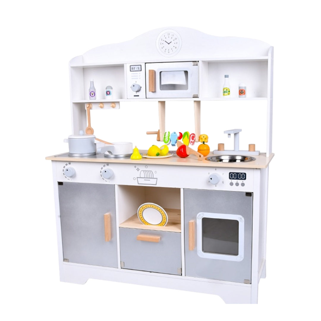 Bring endless fun to your child’s playtime with this beautifully crafted Wooden Kitchen Playset. Measuring 80cm x 30cm x 97cm, it features a realistic design complete with a stove, oven, microwave, sink, and a variety of kitchenware and pretend food items. Perfect for encouraging imaginative role play, it helps develop fine motor skills, creativity, and social interaction. Made from high-quality, child-safe wood with a sturdy build, this set is ideal for children aged 3 and above and makes a charming addition to any playroom.
