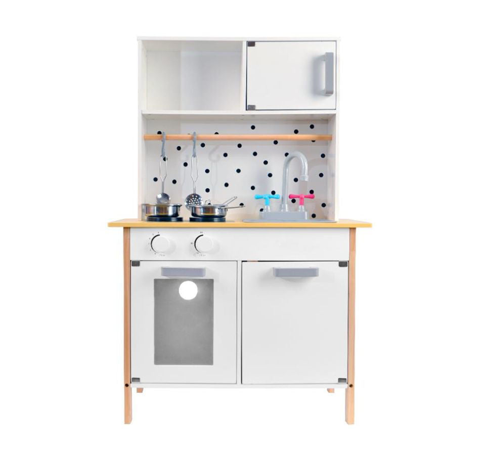 Fuel Imagination and Fun with Our Modern Kids' Play Kitchen! This charming 90cm tall play kitchen is built from real wood and boasts a modern design with a touch of classic wood grain, making it a perfect fit for any stylish home.