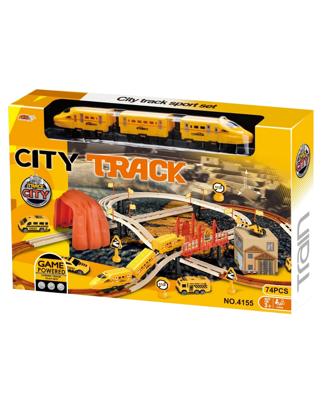 This train set includes a yellow electric locomotive with two wagons, track pieces, bridge supports, and accessories like road signs and trees. With light and sound effects and optional glowing tracks, it provides educational and interactive play that encourages creativity and hands-on learning.