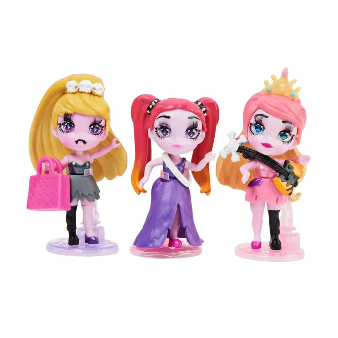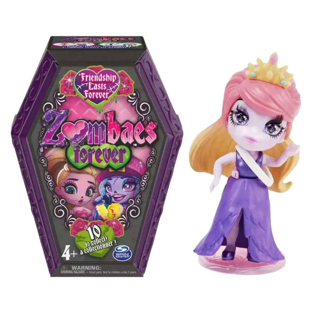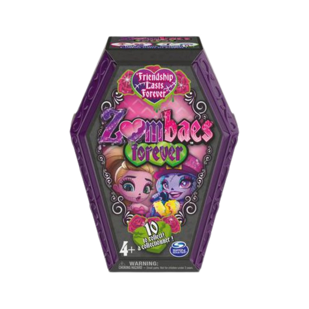 Unbox the excitement with Zombaes Forever, the collectible zombie dolls that mix creepy-cute style with endless play possibilities. Each 3.5-inch doll comes in a coffin-themed blind box featuring a surprise character, fun accessories, a sticker sheet, a stand, and a collector card with exclusive artwork. Kids can mix and match hair and legs across dolls, discover glittery brains hidden under their hair, and enjoy witty character names inspired by their spooky backstories. Perfect for children ages 4 and up, these dolls offer fun fidget features and make great gifts for fans of collectibles, fashion dolls, and imaginative play. Collect all 10 dolls and explore the deluxe sets for even more thrilling surprises!